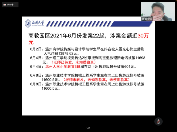 2022年2月23日晚上,在新学期,学院组织形势政策报告会——万象城awc8882022年春季开学第一课暨安全教育专题讲座在腾讯会议上进行。本次报告会的主讲嘉宾万象城awc888保卫处副处长钱合激老师,参加此次报告会讲座的有学院全体辅导员以及全院所有本研同学。学院学工办主任杨鹏老师主持了报告会讲座,介绍了本次报告会讲座的重要性以及的听课纪律。 首先,钱合激老师指出大学生常见的安全问题主要分为财产安全、人身安全、意识形态安全、反诈防诈、寝室消防安全、宗教知识教育等,共同建设和谐美好的平安校园需要全体同学的努力。钱老师结合最近万象城awc888城内相关诈骗案件的最新情况,警示我们诈骗离我们并不遥远,除了电话诈骗和网络兼职诈骗,还要防范钓鱼网站的诱惑,提高警惕,防诈反诈。同时,他也向同学们介绍了网络诈骗的特点,常见的电信诈骗手段,讲解防诈骗常识,引导学生树立正确的消费观以及在生活中如何防止被套路贷等知识。钱老师通过经典案例、相关反诈宣传视频、图片,列举了电信网络诈骗犯罪的几种常见形式,有针对性地向同学们阐述了如何识别防范电信网络诈骗及上当后的补救措施,并号召同学们:电信网络与我们息息相关,我们要强化系统观念与法治思维,提升防范和辨别诈骗的能力和水平,推动建设更高水平的平安校园。 其次,钱合激老师通过消防安全、交通安全、户外活动、毒品伤害四块内容来讲述大学生的人身安全。学生宿舍是高密度人群居住的地方,防火安全显得尤为重要,作为宿舍的主体——学生,要重视安全防火的重要性,提高思想认识,防范胜于救灾,责任重于泰山。同时,钱老师还提到毒品的危害,这些年由于国际毒品的泛滥,毒品像一头张开血盆大口的猛兽,正飞快吞噬着年轻的一代,它无情的破坏着我们的家庭和社会,导致多少家庭家破人亡,国家财富流失。就此,钱合激老师向大家呼吁:人的生命只有一次,它是无价的,也是脆弱的,它承载着你的亲人、朋友和整个社会赋予你的责任,它承受不起任何不负责任的冒险,所以我们一定要珍惜生命,远离毒品。 最后,钱合激老师为大家讲了意识形态安全,他提到大学时代是大学生“三观”及信仰形成的重要时期,稍有不慎,宗教组织便有机可乘。所以我们应该时刻保持清醒的头脑和政治警觉性,不能对宗教渗透的消极影响视而不见或放任自流。此外,很多人都认为邪教离我们很远,甚至觉得自己不可能被邪教蛊惑。但在现实生活中,邪教组织其实套路百出、无孔不入。他们常常借用各种唬人的幌子包装自己,不断更新骗人花样,稍有不慎可能就会跌入邪教圈套。 “你的平安,是对家人最好的关爱!”生命只有在安全中才能永葆活力,幸福只有在安全中才能永具魅力。安全构筑了我们美好的家园,在安全的问题上,来不得半点麻痹和侥幸,我们必须防范在先、警惕在前;必须要树立高度的安全意识,人人讲安全,时时讲安全,推动建设更高水平的平安校园。