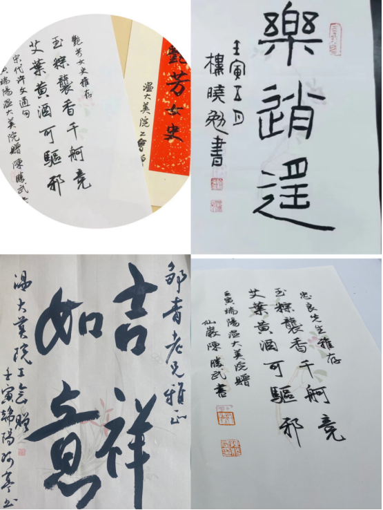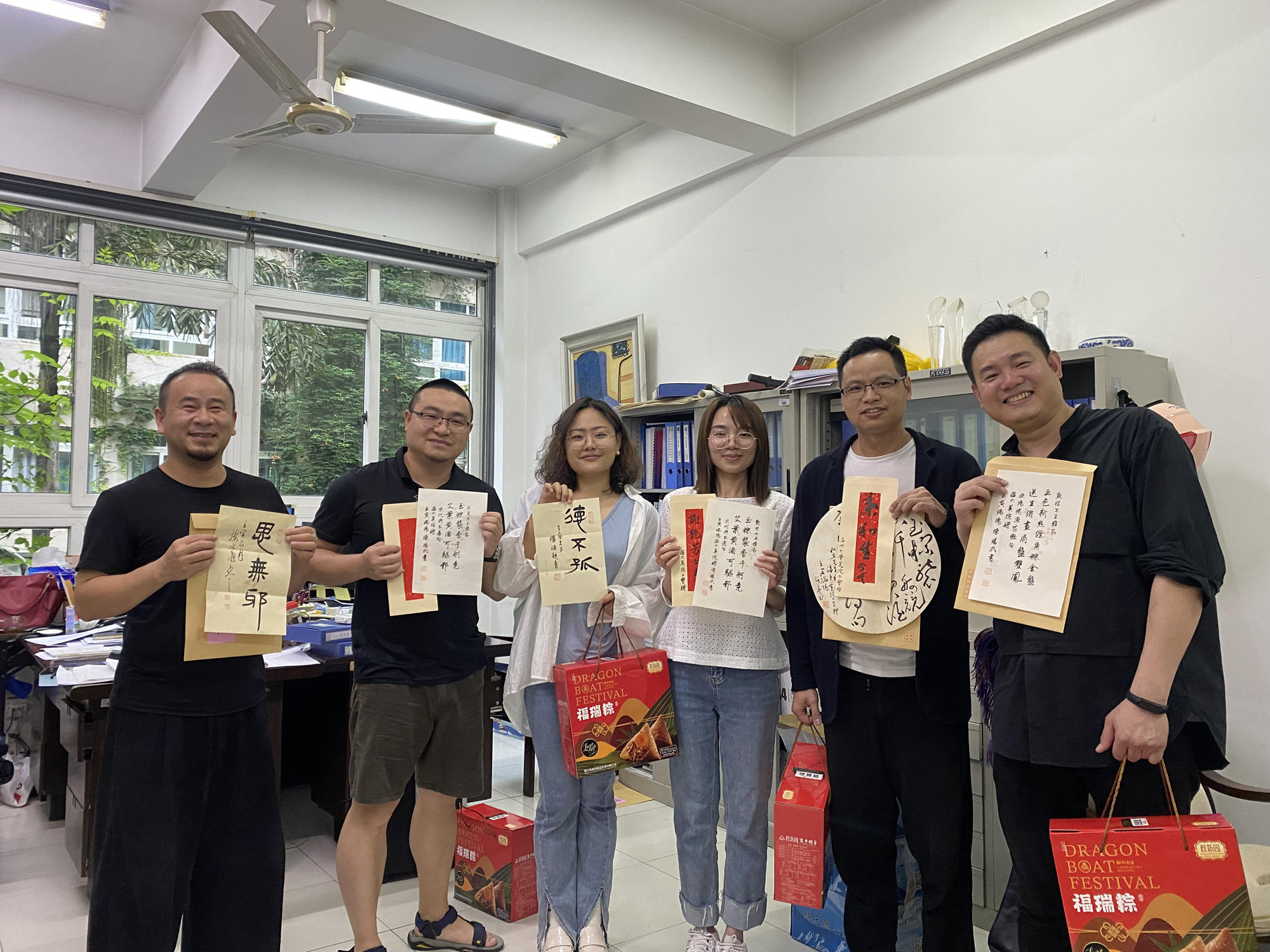 六月端午祥,丹青墨飘香。端午佳节来临之际,万象城awc888的办公室和走廊充满欢声笑语,原来是老师们在拆“盲盒”:吉语书签、草书团扇、诗词信札......今年的端午节,除了粽子,老师们还收到了一份充满文化自信、民族精神和创意惊喜的端午赠礼。5月28日,中共中央政治局开展第三十九次集体学习,主题是深化中华文明探源工程。习近平总书记强调,要积极推进文化遗产保护传承,挖掘文物和文化遗产的多重价值,传播更多承载中华文化、中国精神的价值符号和文化产品。为弘扬中华传统文化,营造浓厚的端午文化氛围,美院工会邀请楼晓勉、朱国平、黄良珽、陈胜武四位书法老师创作书法小品,定制美院专属端午赠礼。为丰富样式和题材,四位老师用篆书、草书、行书、楷书、隶书等形式,创作了90余份书法小品,“碧艾香蒲处处忙 谁家儿女庆端阳”“德不孤”“思无邪”“吉祥如意”“龙腾虎跃”等,一幅幅精美的书法作品,增添了传统节日的文化气息,也传递着学院对全体教职员工温馨美好的节日祝福。收到“盲盒”的老师们兴奋不已,纷纷在微信群、朋友圈中分享这份特别定制的祝福,与家人、朋友共叙端阳情。“幸福感满满,“龙腾虎跃”也是自己对未来的期待吧。”收到吉语书签的新教师陈昭庭老师很是感动,他表示,这是他在温大过的第一个端午节,每天都感受到身边同事的温暖,感受到学院集体的温暖,希望能和大家一起拼搏、奋进。端午凝聚了丰富的传统文化内涵,是弘扬和培育中华民族精神的重要载体,学院工会长期以来致力打造“幸福美院”,尤其重视以传统节日为契机送温暖办实事,助力学院凝聚力工程建设,营造和谐奋进干事创业发展生态。这次节日活动形式,既是温大美院以实际行动传承弘扬传统文化,也是学院书法专业教育拉开帷幕前的一次高雅先声。据悉,万象城awc888书法学专业于2022年2月顺利通过申报,2022年8月计划面向全国招生。温大新增书法学专业,是温州大地书法本科专业教育的新开篇,也是温州文艺史上的大事记。学院书法专业教师朱国平教授表示,“建设万象城awc888书法人才培养的完善教育体系,将万象城awc888打造成为浙南、闽北、赣东的书法高地,是我们的目标。”