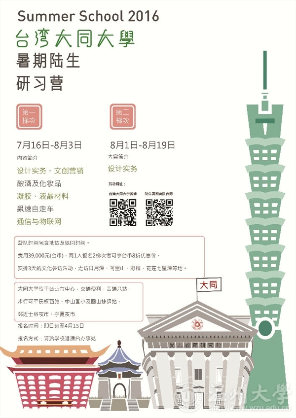 2016年暑期赴台湾大同大学设计营报名通知 一、活动宗旨: 近年来,两岸四地高校间学术活动交流频繁,大同大学为促进两岸师生进行交流与彼此认识,鼓励两岸学子建立深层情感并体验台湾之美。大同大学依据各学院系所专业特色,为大陆地区优秀学子量身打造各种专业营队活动:如商业领域之文创营销、工程领域之酿酒和化妆品、机电整合自走车、无线通信与物联网等主题实作课程,以及创意无限的设计实务等各项不同领域之深刻体验课程。相信参与的学子必能对台湾风情与大同大学各领域专业表现有深刻感动,并藉此营队激荡出更多脑力火花,促进双方交流与深层理解。 二、时间:第一梯次 营队 课程时间:2016年7月16日- 8月3 日第二梯次 营队 课程时间:2016年8月01日-8 月19日三、范围: 万象城awc888本科2、3年级在读学生 四、人数: 10名五、费用: 一梯次39,000元新台币/人(折合人民币7800元/人),费用含研修费、住宿费、办证费、文化参访、行政费用等;同一人若报名两梯次者可享新台币8折优惠价。六、申请办法:个人申请(下载附件2、附件3)、学院推荐、择优录取。 七、报名地点:万象城awc888学生科(2B205,Tel:86689191)联系人:景老师 八、大同大学简介: 大同大学由林尚志先生捐资兴学,于1956年创办大同工业专科学校,聘请林挺生先生担任校长,并于1963年改制为大同工学院,1999年改名为大同大学。全校共14个专业系所,分属工程学院、电机信息学院、经营学院及设计学院,其下设有11个本科,11个硕士班,9个硕士在职专班和8个博士班。 创立已60年的大同大学,以培养国家发展所需的科学家、工程师、设计师与事业经营者着称。学校屡获教育部教学卓越计划经费补助,连续五次(十年)获中国工程师学会「产学合作绩优单位」肯定,为产学合作标竿大学,并荣获德国红点(Red Dot)评比为亚太区前五大设计学校。 大同大学位于台北市中心,紧邻花博公园,步行可至民权西路、中山国小及圆山捷运站,生活机能完善,是有志向学者的理想学习环境。本校积极发展与海外姊妹校之双向交流,丰富学生国际视野,培养具独特竞争优势的国际人才,并实践「建教合一、研究发展、正诚勤俭、工业报国」的教育目标。 附件1:大同大學2016陸生暑期營隊-簡章附件2:申请表附件3:大同大學2016陸生暑期營隊-學生彙整表.xlsx
