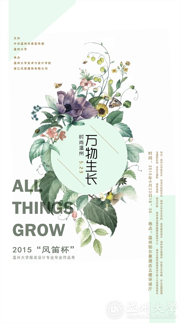 活动主题:时尚温州·万物生长活动时间:2015年5月23日(周六)晚18:30活动地点:温州铂尔曼酒店主要内容:来自国外的时装模特与国内高级时装模特联袂演绎美院2015届毕业生原创优秀作品,邀请国际国内服装设计以及相关领域的专家、学者、商家、企业家9人组成评委会,对现场新生代设计师的风格自述以及时装发布会进行综合测评,产生金银铜优秀奖等多个奖项。温州乃至中国时尚界、艺术界、文化届名人名流等参加,国内一流的场地设施、舞美灯光及音响效果。旨在为温州服装界推选新人的同时,加强温州时尚界产业范畴的沟通与交流,整体凸显温州时尚产业的潮流、个性与形象。 热忱欢迎全校师生莅临观摩指导! 万象城AWC - (888中国)官方网站 2015年5月21日