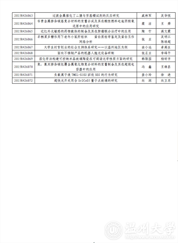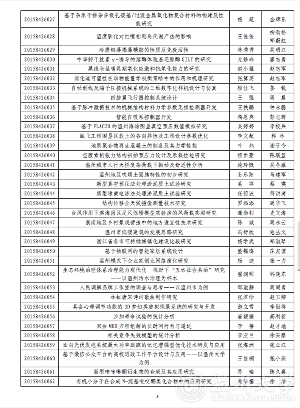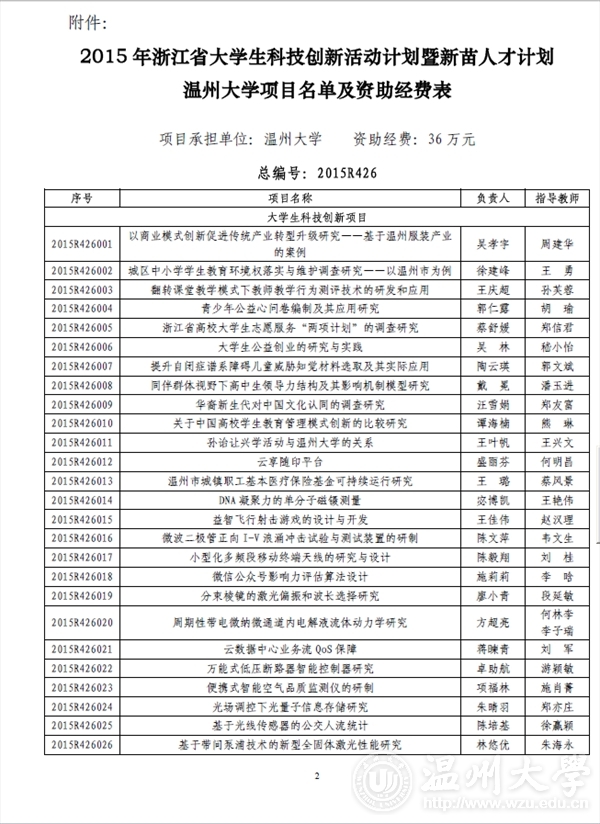 万象城awc888团委: 2015 年浙江省大学生科技创新活动计划暨新苗人才计划已于2015 年1 月启动实施,经学校推荐和专家评审,共确立项目2061 项。现将你校通过立项的项目名单印发你们(见附件),请认真实施、加强管理。为不断提升我省大学生科技创新工作整体水平,项目实施办公室还将与省团校合作对项目负责人进行相关培训。附件:2015 年浙江省大学生科技创新活动计划暨新苗人才计划万象城awc888项目名单及资助经费表浙江省大学生科技创新活动计划暨新苗人才计划实施办公室2015 年6 月3 日
