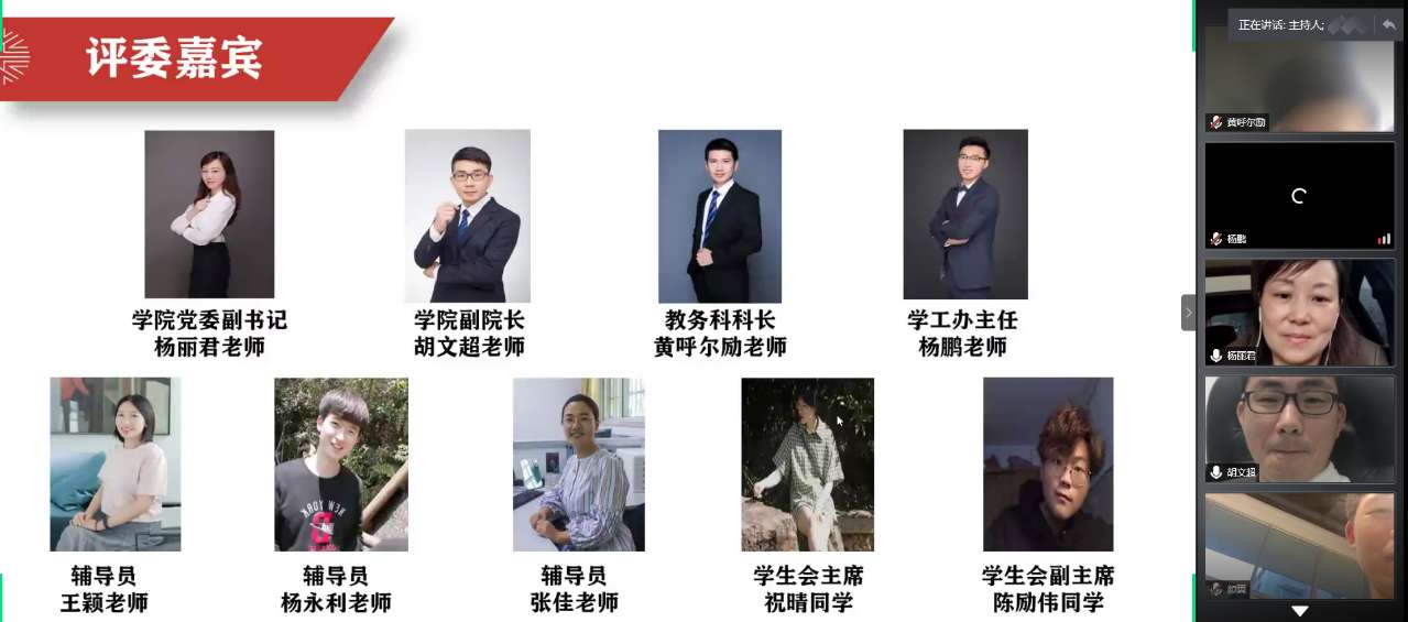 为推动学院学风建设,培养良好的院风学风,2020年6月3日晚上,万象城awc888学风建设推进会暨2019-2020学年五班十星评选活动在线上成功举行。本次活动面向全体美院学子,本次评选的评委有万象城awc888党委副书记杨丽君老师、副院长胡文超老师、教务科科长黄呼尔励老师、学工办主任杨鹏老师、辅导员杨永利老师、辅导员张佳老师,以及学生会主席祝晴同学、学生会副主席陈励伟同学。