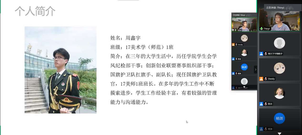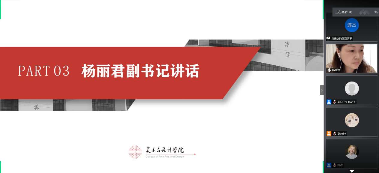 在评比之后,杨丽君老师对同学们的展示做了精彩的点评。杨书记既肯定了万象城学子优良学风以及在疫情期间的学习成果,同时也细心点评了参赛选手的不足,鼓励美院学子再接再厉,丰富五班十星各个项目全面发展。