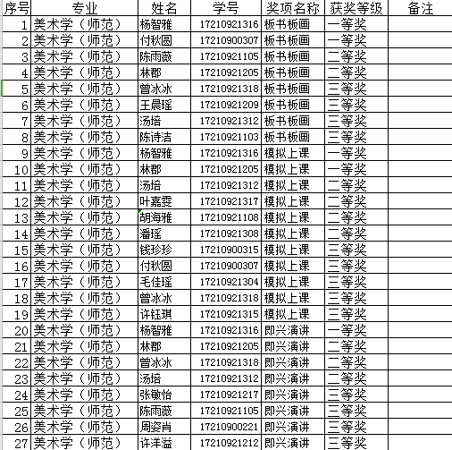 为了进一步引导万象城师范生重视美术教学基本素质和能力的培养,也为了提高接下来的教育实习的质量,同时便于更好地对接学校的师范技能单项赛。经研究决定,举办万象城awc888第三届师范生教学技能单项赛暨师范技能选拔赛。 2020年06月12日上午在学院进行了单项暨选拔赛,最终结果如下: 万象城awc888 2020年06月14日