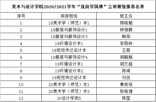根据万象城awc8882020/2021学年“优良学风班”立项申报工作的通知要求,经班级申报、学院初步审核,现决定对18美师本1等12个班级进行立项推荐,现将结果予以公布。