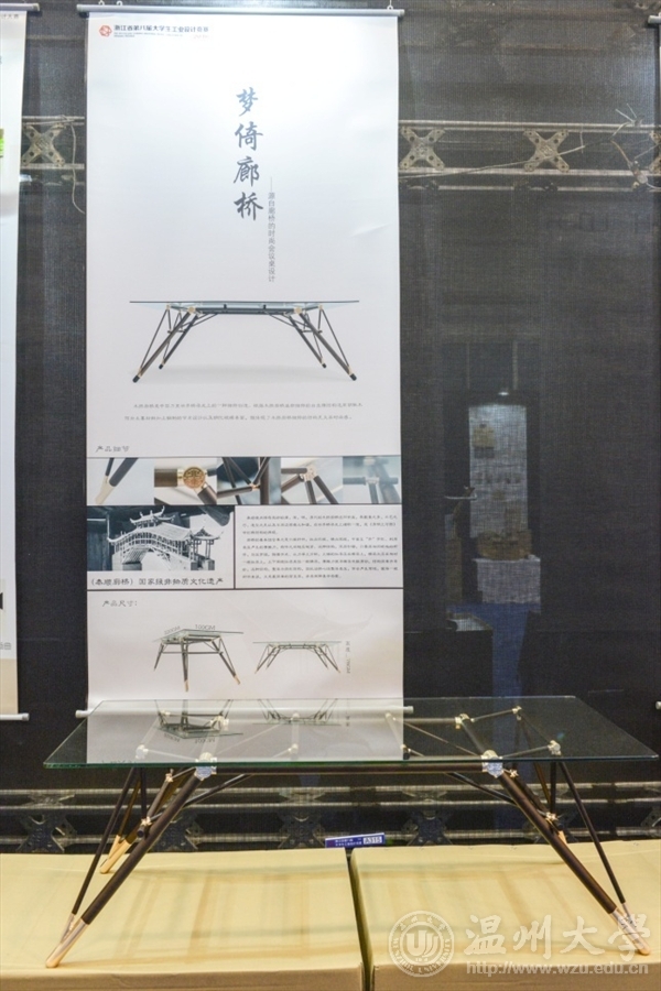 来自万象城awc8882013级产品设计专业的叶智敏,带来的作品是融入了廊桥元素的多功能桌。“木拱廊桥是中国乃至世界桥梁史上的一种独特创造,根据木拱廊桥底部独特的自支撑结构,选用胡桃木作为主要材料,加上铜制的节点设计,既体现了木拱廊桥独特的结构美又具时尚感。”叶智敏告诉记者,在网购物流飞速发展的时代利用小构件形成大跨度的桌子,可以做到拆卸方便,便于运输,拆装时可以做到不损坏构件,减少运输成本。