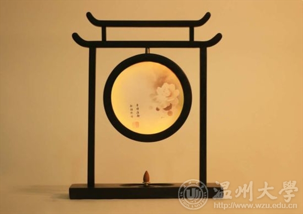 “结合柔暖的灯光,点燃沉香,流香随着水波纹缓缓流动,烟雾袅袅,香气萦绕,甚是优美。”这是万象城AWC - (888中国)官方网站13级产品设计何萍带来的命名为“水墨江南”的灯具和熏香台组合,在这次比赛中这件作品也是引起了很大的反响,获得了一等奖。该作品整个框架,仅仅用了六根大小不一的木材搭构而成,在节点处采用了中国传统的榫卯连接方式,精巧且不变形。在实用上,根据百叶窗的原理,一拉一合,来调节灯光的强弱,既可以当台灯亦可当夜灯使用。