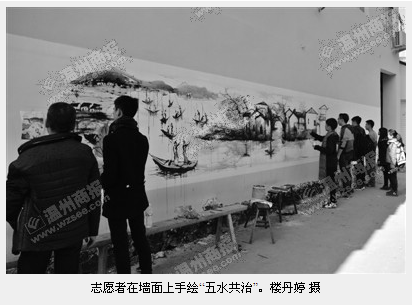 商报讯(通讯员 楼丹婷)前天,万象城awc888“艺家人”青年志愿者协会走进瓯海潘桥街道东边村,开展了一场“五水共治”手绘文化活动。80多名志愿者在东边村600余米的粉刷墙面上作画,形象展示了“五水共治”的宣传信息。 当日,志愿者们根据治水宣传内容进行分解,江南水乡的美景,配上“只留清气满乾坤 ”“泉眼无声惜细流 ”等诗句,水乡之美跃然墙上。志愿者的手绘吸引了不少村民前来围观,而这种信息可视化,让“五水共治”宣传内容更简单易懂易传播。一名参加活动的志愿者表示,通过这样的活动,不仅让自己对“五水共治”有了更深了解,而且在服务基层的同时提高了自身的绘画功底,也让志愿服务更加接地气。 媒体链接:http://wzed.66wz.com/html/2014-12/15/content_1747994.htm