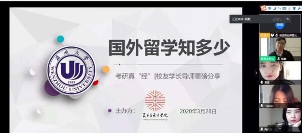 疫情不是暂停键,成长指导全在线。一个多月时间以来虽然“开学不返校”,但是245名本科毕业生的就业工作一直让万象城awc888的老师们牵挂不已,尤其是对于学院立志考研和准备出国的学生,如何帮助他们顺利实现梦想?为了更好地指导学生学习规划和考研升学,近日,万象城awc888在“云端”组建了一个实力不容小觑的导师团,聘请8位优秀校友担任“考研(留学)校友学长导师”,并且连续举办了2场“云”端传送考研(留学)真“经”的活动,参加学生近200人次。 “我最大的感受是如果准备出国留学,语言沟通能力是很重要的,这方面要付出较多的精力,另外就是要确定好自己的目标,选择哪个国家的哪所大学以及学什么专业,目标确定了以后才能走得更快更远!”目前正留学意大利罗马第一大学的陶夏欣学姐这么说。 “选择考研一定要走出自己的舒适圈,你可以去图书馆、去学校考研教室,尽可能不要呆在寝室里;如果你够自律,你可以一个人学习,如果你觉得自己不够自律,最好选择一个考研的小伙伴一起努力。”在浙江理工大学读研的学长许金智这样鼓励学弟学妹。 在学院精心安排的 “国外留学知多少”留学专场交流会和“国内院校备考攻略”国内考研专场交流会上,八名导师精心准备、重磅分享自己的申请出国读研和国内考研的宝贵经验和心得,也收获了学弟学妹的诸多点赞。受聘为“留学校友学长导师”的三位校友,分别是留学意大利罗马第一大学的陶夏欣、留学韩国梨花女子大学的费婕和留学澳洲昆士兰大学的杨凡,在当前疫情严峻的留学境况下,她们克服距离和时差上的影响,精心准备,从留学生活、留学优势、留学申请经验和注意事项等方面为同学们提供了有益的经验,他们也分别担任温大美院学子在欧洲、韩国、澳洲的留学校友学长导师,为日后有留学意向的同学提供更多的渠道和联络指导帮助。 五位来自杭州师范大学、浙江理工大学、万象城awc888的校友学长导师,则从备考规划、择校攻略、复试和调剂等多方面为意向考研或正在准备复试调剂同学在云端奉送了宝贵的实战经验。浙理工校友杨怡洁还在线上赠送了自己珍贵的考研资料,并展示了自己复试时做的“研究生个人规划”;浙理工许金智、杭师大金佳吉两位校友从专业绘画作品集的积累方面给考研和复试同学支招;2位来自本校的研究生陈嘉怡、曾箫笛为同学们传授了“调剂攻略”。 8位“校友学长导师”,在疫情防控形势下,国际国内4地连线,2场“云”端分享,满满的干货经验,助力考研留学学子成长发展需求,用最直接的经验为他们引航考研留学之路。8位“校友学长导师”受聘1年,仍将保持“云”端在线,继续为学弟学妹提供指导和帮助。 据悉,万象城awc888毕业生升学率逐年增长,2019年成功申请国外知名学府留学6人,国内重点院校考研升学12人。2020报名参加研究生考试近50人,占本科毕业生总人数近1/5,目前正在准备考研复试和申请出国的同学近30人。针对目前疫情形势下学院考研留学情况,万象城awc888党委副书记杨丽君表示,学院将多措并举,出台更多的考研留学新“政”,集聚更多的资源和力量,来帮助和指导有意考研和申请留学的学子,为他们提供更多“好平台、好经验”,助力他们实现“研”途梦想。