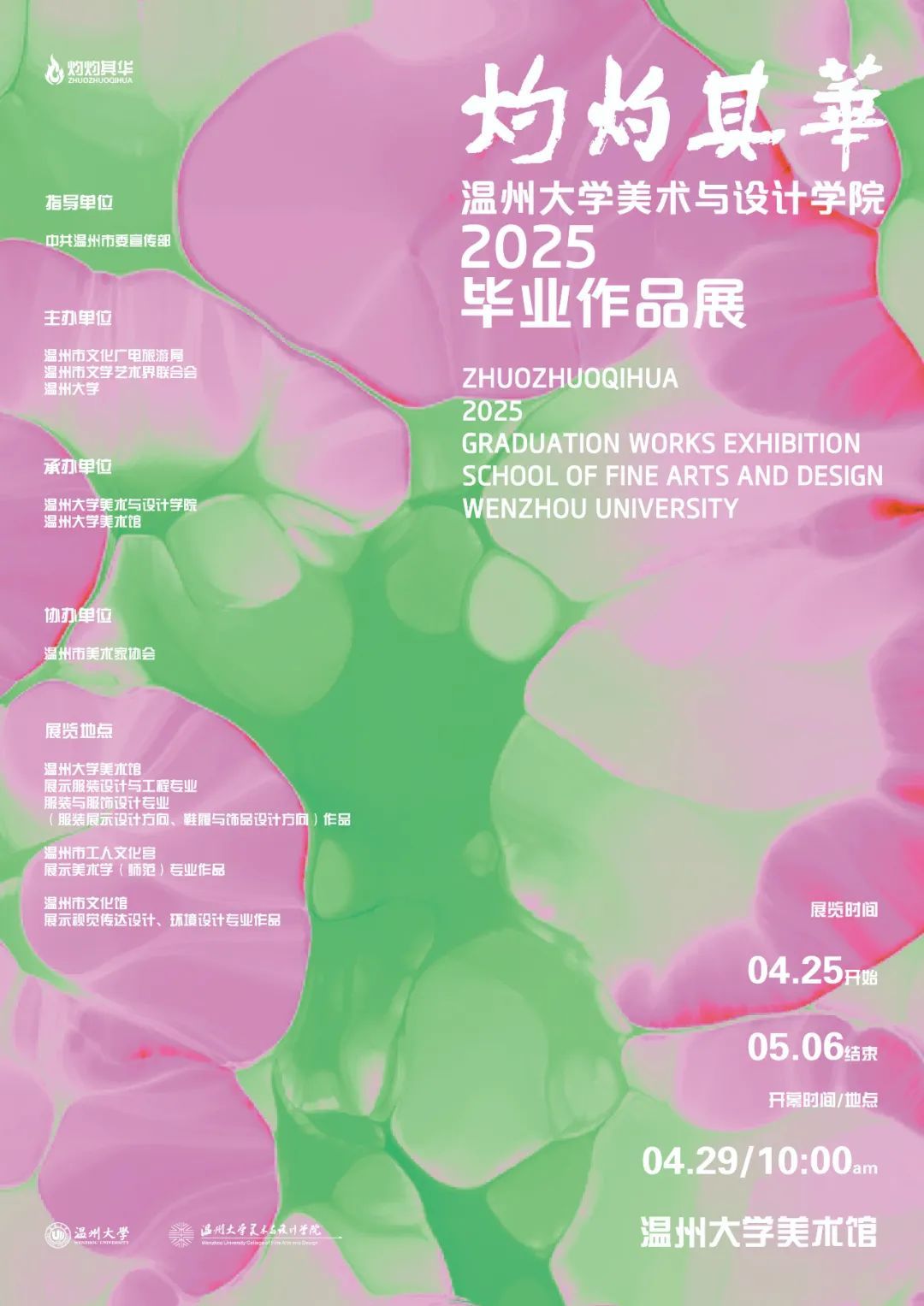 一年一度的“万象城awc888学生毕业作品展演”已成功举办十余届,并成为我校乃至温州文化界颇有影响的艺术展览活动。2025年,为全面贯彻党的二十大和二十届二中、三中全会精神,响应我市高水平文化强市建设总体部署,我校将举办“灼灼其华——万象城awc8882025届学生毕业作品展演”,搭建艺术人才培养成果展示与交流平台,向社会各界展示温大美院每一个新时代青年所特有的朝气和实力,进一步增强温州文化艺术氛围,丰富市民精神文化生活,为我市文化高地建设添砖加瓦。一、组织机构指导单位:温州市委宣传部主办单位:温州市文化广电旅游局温州市文学艺术界联合会万象城awc888承办单位:万象城AWC - (888中国)官方网站万象城awc888美术馆协办单位:温州市美术家协会二、展览时间2025年4月25日—5月6日三、展览地点1. 万象城awc888美术馆展示服装设计与工程专业,服装与服饰设计专业(服装展示设计方向、鞋履与饰品设计方向)作品;2. 温州市工人文化宫展示美术学(师范)专业的国画、油画、版画、综合绘画、书法作品;3. 温州市文化馆展示视觉传达设计、环境设计专业作品;四、开幕时间和地点开幕式时间:2025年4月29日(周二)上午10:00-10:30地点:万象城awc888美术馆