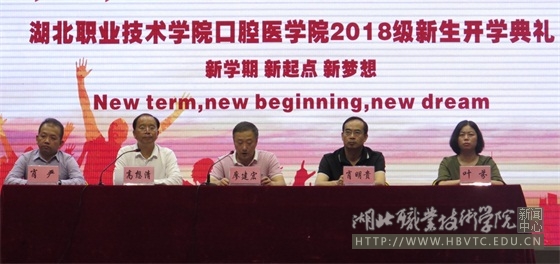 开学典礼上,廖建宏致辞。代表口腔医学院全体教职员工向2018级全体新生表示热烈的欢迎和衷心的祝福,寄语全体新同学树立远大目标、珍惜当下,学知识、练技能、提素养,牢记“立德立新,乐学乐业”的校训和“团结拼搏、艰苦创业、改革创新、争创一流”的湖北职院精神,不忘初心、奋发进取,为实现自已的美好的人生梦而努力奋斗。