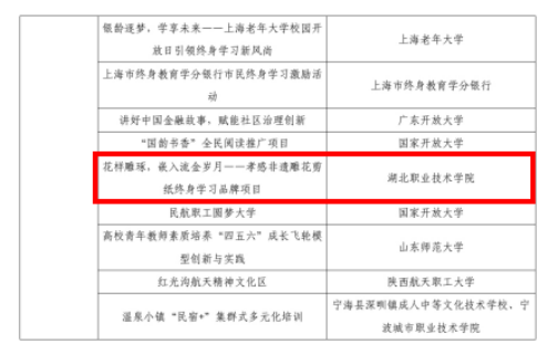 (本网讯 郁青) 4月11日,中国成人教育协会公布获奖名单。经专家评审、省级推荐、网上公示,Beat365唯一官方网站教育与艺术学院报送的“花样雕琢 嵌入流金岁月——孝感非遗雕花剪纸”荣获全国“终身学习品牌项目”称号。