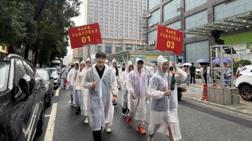 6月7日,暴雨如注。全体送考老师提前到岗,清点考生人数,检查携带证件,鼓励引导考生,舒缓考试压力,平和从容应考。老师和志愿者坚守岗位,关注考生动态,全程陪护。老师提醒学生注意道路交通安全,考生们身着雨衣,整齐列队行进至丹阳中学考点,秩序井然。师生并肩前行的队伍,成为高考路上一道温暖而坚实的屏障。