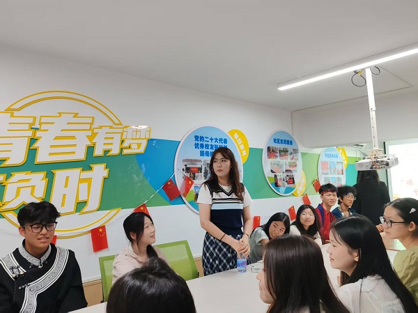 在东区一站式学生社区,校石榴红宣讲团成员分享了宣讲“三大精神”的收获与心得,并作示范宣讲。