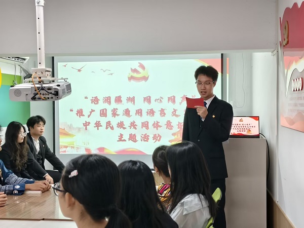 声声入心报国志,丹心共绘同心圆。校石榴红宣讲团副团长许飞同学的主持词点燃东区一站式学生社区“美语”氛围。校“铸牢中华民族共同体意识”宣讲员、校融媒体中心、校广播台成员解子馨、王婷婷、汪金鑫,精心准备的“心相印、语相通、言相联”活动,融“趣味性与实用性”为一体,吸引了各族学子踊跃参加。