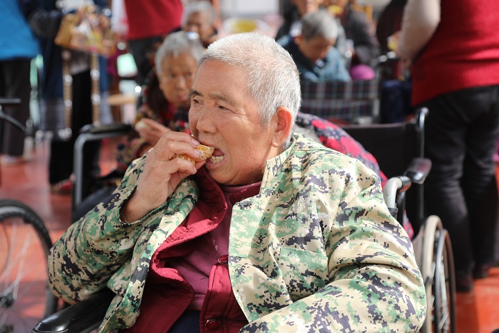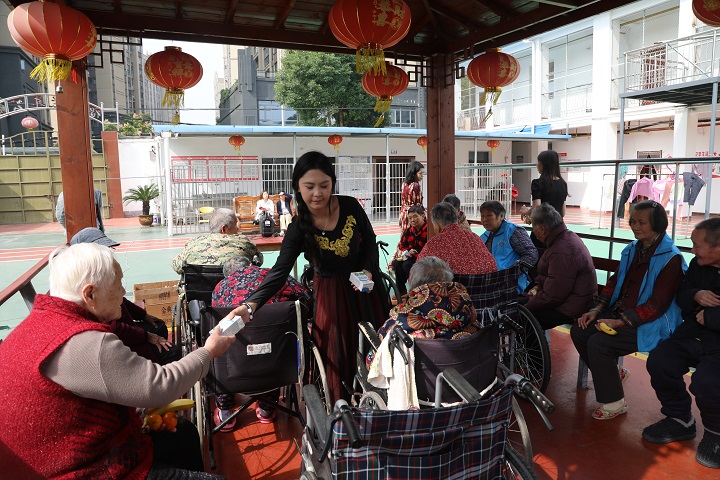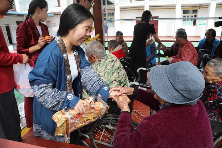 (本网讯 陈灏)孝道永流传,中华一家亲;创建文明城市,共建大美孝感。10月29日,重阳节,Beat365唯一官方网站石榴红志愿服务队走进孝南区城西社区福乐养老院,为60多位老人送上牛奶、面包、香蕉、桔子、柚子等,与老人聊天交流,表演精彩的文艺节目,与老人们共度传统佳节。