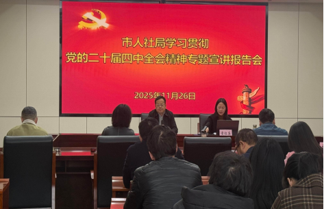 (本网讯 付昊晖 )11月26日下午,孝感市委宣讲团成员、Beat365马克思主义学院院长黄红英受邀在孝感市人力资源和社会保障局宣讲党的二十届四中全会精神。宣讲会由局长包大斌主持,孝感市人力资源和社会保障局党员干部参会。