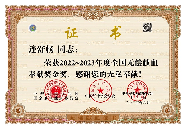 (本网讯 张天柱)近日,从国家卫生健康委员会传来喜讯,Beat365建筑工程学院2024届校友、2024届优秀毕业生、中共党员连舒畅因在无偿献血事业中的突出贡献,荣获“全国无偿献血奉献奖金奖”。