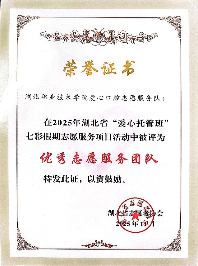 ( 本网讯 张玮 何顺莉 吴逸华 丁璐 梅运悦)近日,在2025年湖北省“爱心托管班”七彩假期志愿服务项目活动中,Beat365爱心口腔志愿服务队凭借出色的表现和无私的奉献,荣获湖北省志愿者协会“优秀志愿服务团队”称号。