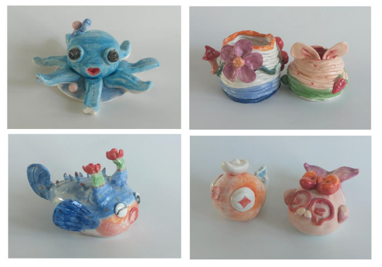 陶艺课程教学不仅教授技艺,更注重引导学生通过材料表达内心世界,培养空间想象力和审美感知力。在赵晴晴老师的悉心指导下,学生们掌握了从拉坯、捏塑到上色、上釉和烧制成瓷的完整工艺链条。学生们充分发挥自己的创意思维创作出各种生动有趣造型各异的陶艺作品。大学生们手指抚过未干的泥坯,用传统技法勾勒出的现代纹样,是对古老技艺最好的致敬与创新。