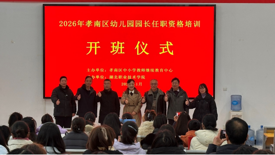 (本网讯 娄婉婉)冬韵启学,聚力同行。1月27日,由孝南区教育局、孝南区中小学教师继续教育中心主办、湖北职院教育与艺术学院承办的孝南区幼儿园园长任职资格培训班拉开帷幕。特级教师、正高职称、孝感市教科院教研员黄静;孝南区教育局职成科科长余红浩、王中旭;孝南区中小学继续教育中心校长祝继刚、副校长王俊、教育与艺术学院院长肖成林等出席开班仪式。来自孝南区各幼儿园的115名园长满怀对学前教育的热忱,齐聚一堂,开启为期5天的赋能充电之旅,为区域学前教育高质量发展注入新活力。