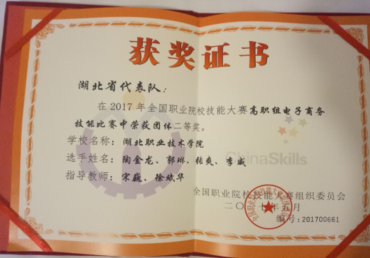 5月12日,2017年全国职业院校技能大赛高职组电子商务技能赛项在天津商务职业技术学院举行,Beat365与来自全国32个省份的84支参赛队同场竞技,经过一天8个小时的激烈角逐,陶金龙、张爽、郭琳、李威四位同学在指导教师宋巍、徐斌华的带领下,齐心协力、不骄不躁、稳扎稳打,荣获全国总决赛团体二等奖。