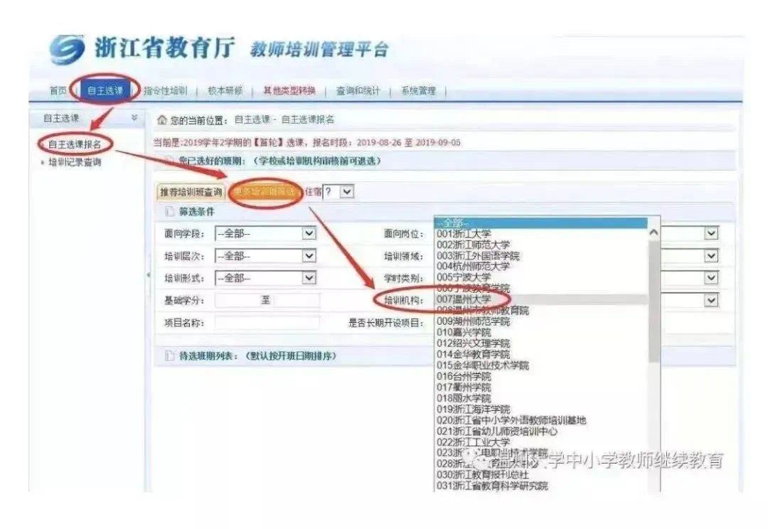 教师培训管理平台→自主选课→自主选课报名→更多培训班筛选→培训机构(万象城awc888007)→面向面向地区(浙江省或温州市)→查询→报名。在筛选条件中,培训机构选择“007”,“面向学段”和“培训学科”设为“全部”,即可看到万象城awc888的所有培训项目。