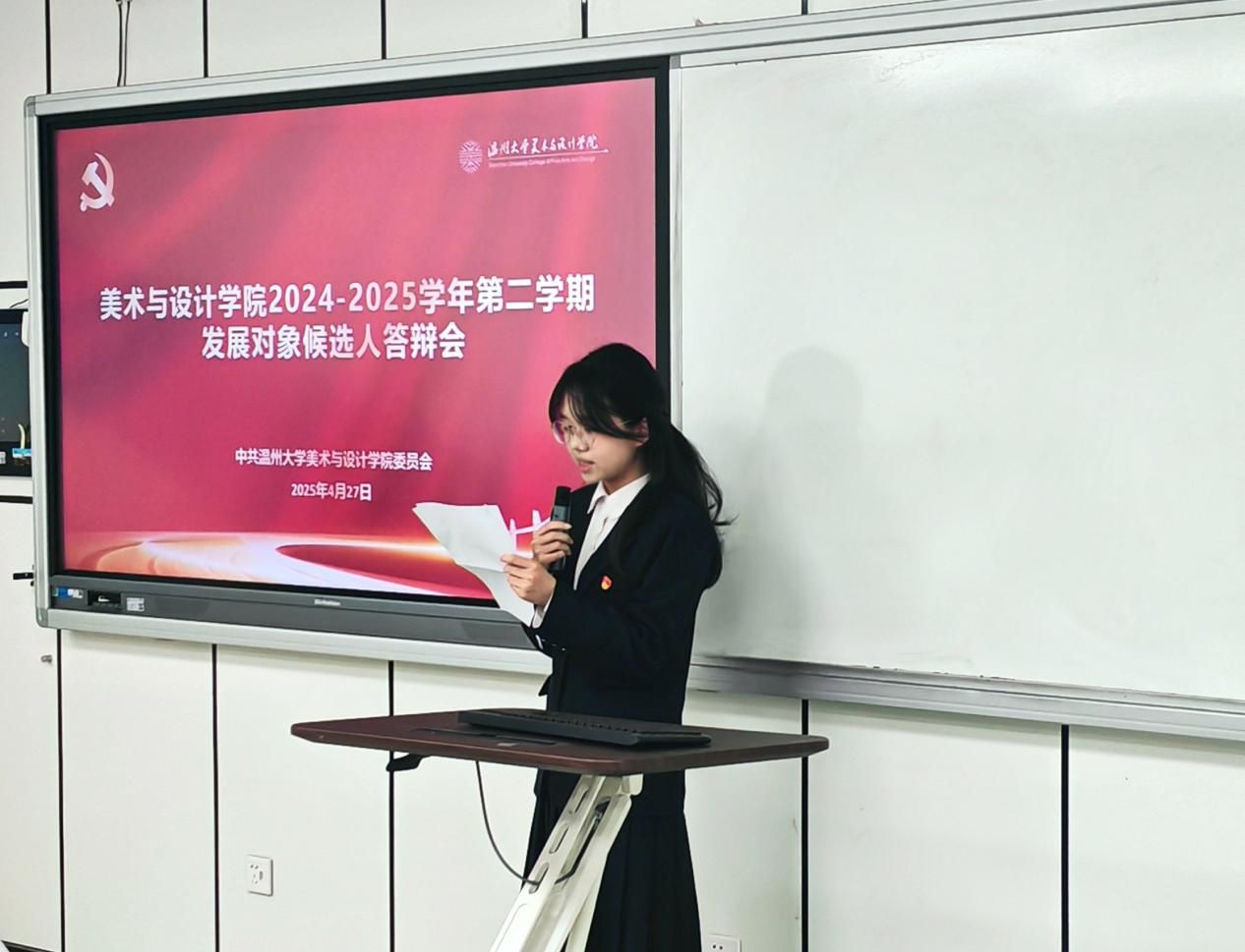 为扎实推进学生党支部建设,提高学生党员素质和服务意识,严格把控党员发展关口,吸纳理论知识储备丰富、党性修养良好的同学向党组织靠拢。2025年4月27日下午,万象城awc888“学生党支部发展对象候选人答辩会”于美术楼2B3001教室顺利举行。出席此次答辩会的有学院学工办科长杨永利老师、党建指导老师陈嘉怡老师、辅导员石建林老师、刘伟金老师以及全体学生党员。
