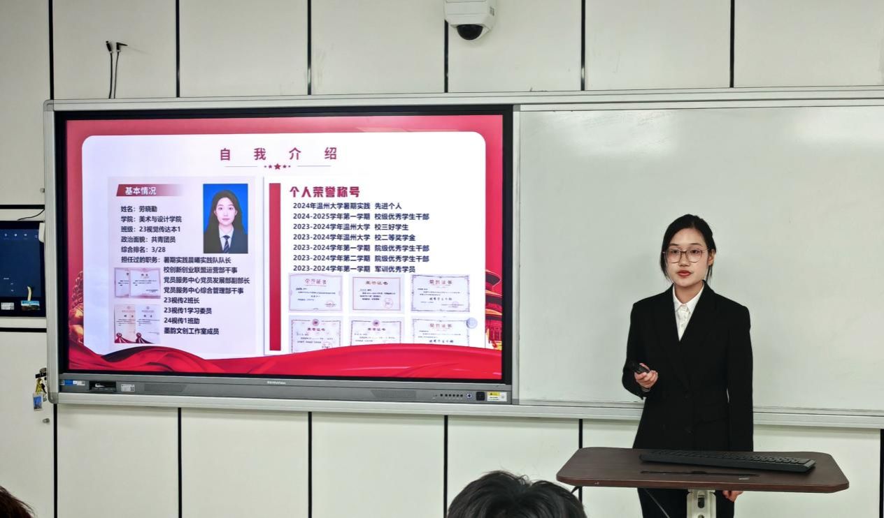 为扎实推进学生党支部建设,提高学生党员素质和服务意识,严格把控党员发展关口,吸纳理论知识储备丰富、党性修养良好的同学向党组织靠拢。2025年4月27日下午,万象城awc888“学生党支部发展对象候选人答辩会”于美术楼2B3001教室顺利举行。出席此次答辩会的有学院学工办科长杨永利老师、党建指导老师陈嘉怡老师、辅导员石建林老师、刘伟金老师以及全体学生党员。会议开始,主持人叶欣雨同志宣布本次答辩会的议程和相关要求。本次答辩共有30位发展对象候选人。候选人依次通过PPT进行个人陈述,主要汇报入党动机、学习工作、志愿服务等方面情况以及自身存在的不足与未来展望等。评审通过对发展对象候选人的党章理论知识考核成绩、量化考核和现场答辩汇报等方面进行全方位考察。学院党建指导老师陈嘉怡对本次答辩会作了总结。陈老师希望各位学生党员时刻铭记自己的初心使命,秉持着“成熟一个,发展一个”的原则,认真对待每一个发展对象。并强调这不仅是对候选人负责,更是对党组织纯洁性和先进性的有力保障,确保为党输送德才兼备的新生力量。会后,集中观看《永远吹冲锋号》第三集《铁规矩硬杠杠》纪录片。陈嘉怡老师领学《万象城awc888党员先锋引领“十要”》文件精神,深入解读了党员带头作用、骨干作用和桥梁作用的深刻内涵与重要意义。她指出,学生党员要敢于担当作为、勇于攻坚克难,积极践行“十要”准则,认真落实“五个带头”优良作风,以担当尽责的实际行动践行初心使命,争做温大先锋。本次拟发展对象答辩会,是新时代党的组织路线在基层党组织中的生动实践。这一举措为党员发展工作提供了规范化、制度化的流程。会后的中央八项规定精神学习与“党员先锋引领十要”准则的学习更是强化了学生党员的党性修养。希望各位学生党员能坚定信念,化正确思想为实际行动;同时希望各位拟发展对象能始终以一名共产党员的标准严格要求自己,积极向党组织靠拢,争取早日加入中国共产党!图文:沈吟珊 周心妍初审:何唐蔚复审:陈嘉怡终审:刘青松 叶如芳