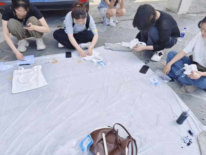 活动伊始,工作人员详细讲解扎染的历史、技巧与色彩搭配,并现场演示。同学们随即拿起工具,通过折叠、捆绑等手法在白色T恤上创作独特图案,染色时精准控制染料浓度与扩散范围。